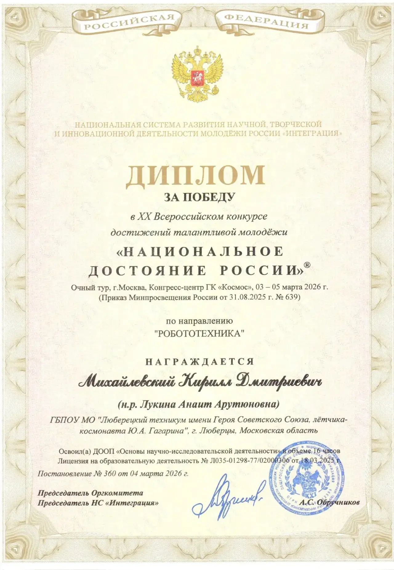 Поздравляем Кирилла, студента 3 курса специальности Эксплуатация беспилотных авиационных систем и его научного руководителя, Лукину Анаит Арутюновну, получивших также ценнейшие знаки отличия!