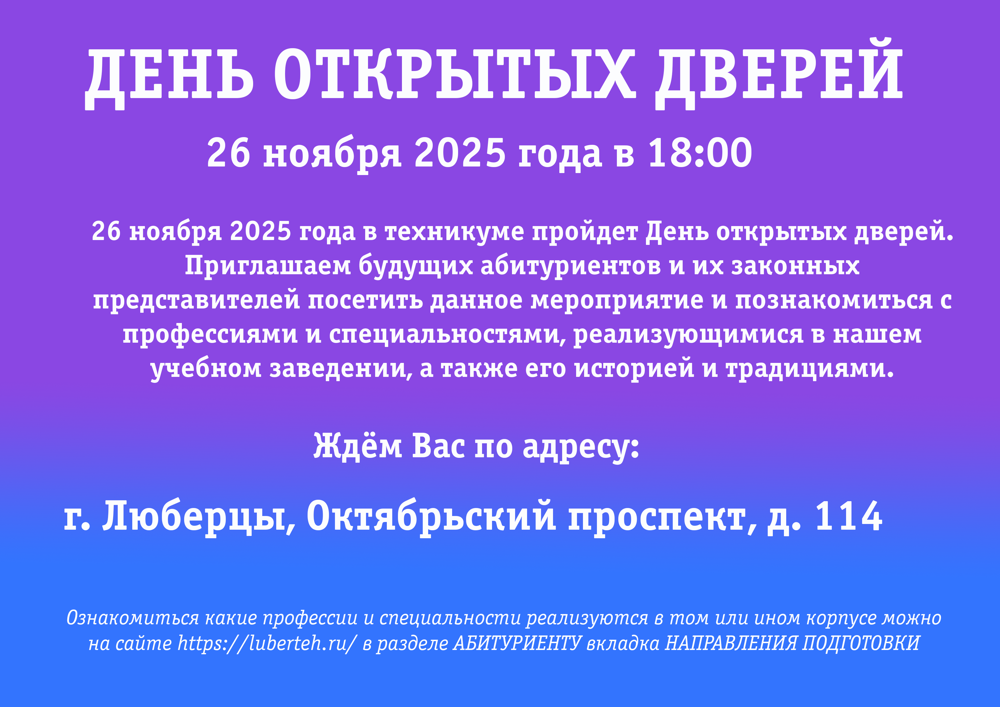 Мы искренне рады приветствовать Вас на страницах официального сайта Государственного бюджетного профессионального образовательного учреждения Московской области «Люберецкий техникум имени Героя Советского Союза, лётчика-космонавта Ю.А. Гагарина»!