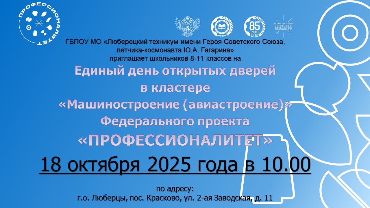 Я искренне рада приветствовать Вас на страницах официального сайта Государственного бюджетного профессионального образовательного учреждения Московской области «Люберецкий техникум имени Героя Советского Союза, лётчика-космонавта Ю.А. Гагарина»!