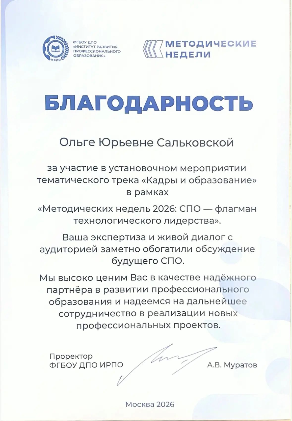 В 2026 году она приняла активное участие в Методических неделях «СПО — флагман технологического лидерства», где поделилась своим опытом и инновационными подходами в обучении, способствующими формированию современных специалистов.