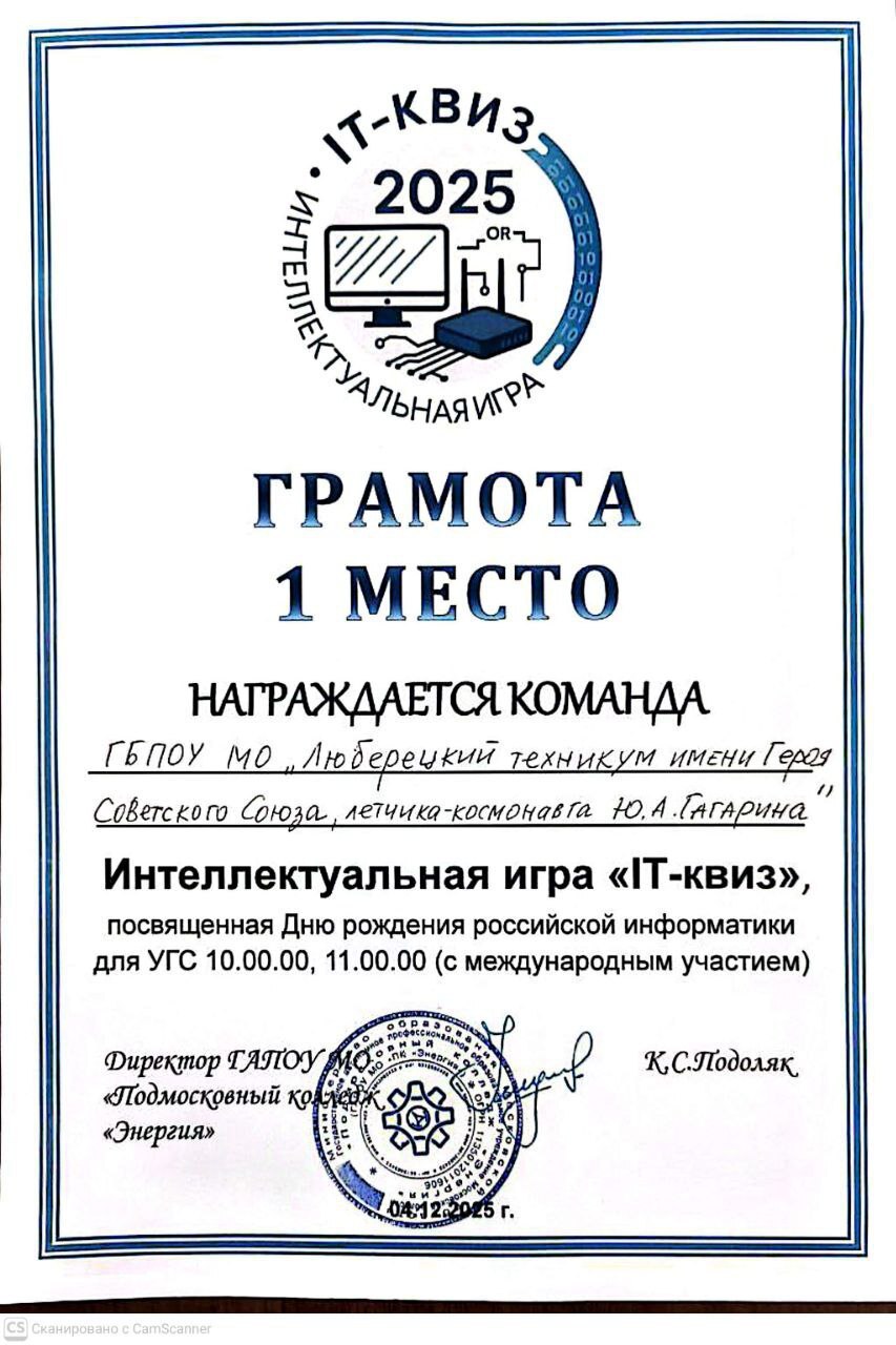Первое место — за нами! Студенты Люберецкого техникума имени Ю.А. Гагарина по специальности «Обеспечение информационной безопасности автоматизированных систем» заняли I место в интеллектуальной игре «IT-квиз», посвящённой Дню рождения российской информатики! Игра прошла 4 декабря 2025 года на базе ГАПОУ МО «ПК «Энергия» (г. Старая Купавна) среди студентов УГС 10.00.00 и 11.00.00 со всего Подмосковья. Команды соревновались в знаниях: - основ ИБ и сетевых технологий, - истории российской информатики, - принципов работы автоматизированных систем. Наши ребята продемонстрировали не только глубокие профессиональные знания, но и слаженную работу в команде! Поздравляем победителей и их наставников — и гордимся вами!