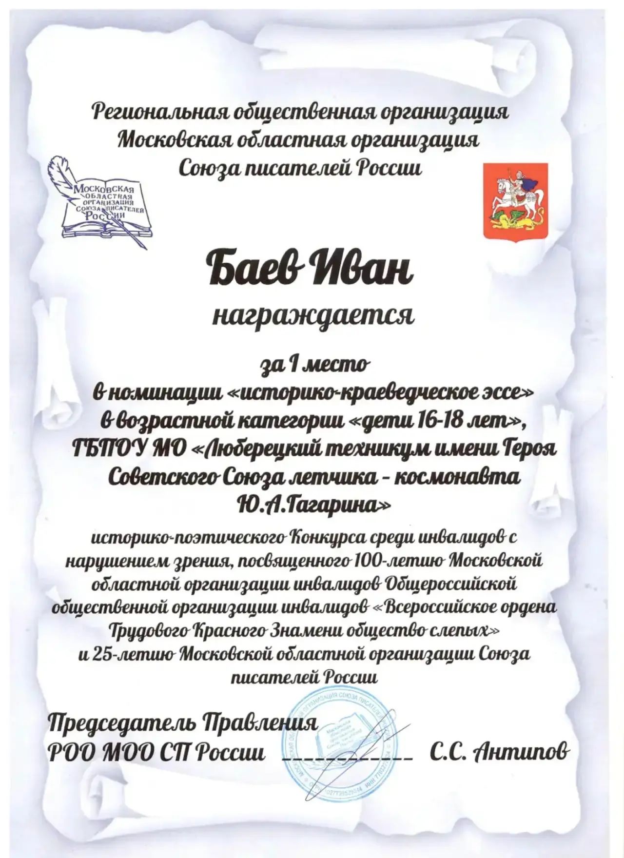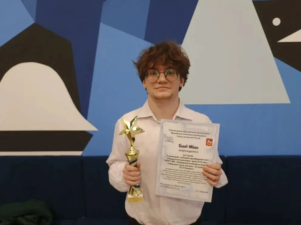 Студент Люберецкого техникума имени Ю.А. Гагарина Иван Баев, награжден Грамотой Московской областной организации Союза писателей России за первое место в номинации «Историко-краеведческое эссе» в историко-поэтическом конкурсе среди участников 16–18 лет.