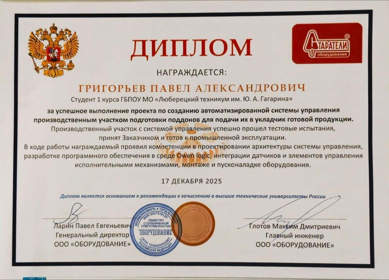 В г. Лыткарино на предприятии компании «Старатели» двое обучающихся помогли запустить автоматизированную линию для упаковки продукции. Над проектом под руководством учредителя компании Павла Ларина работали студент Люберецкого техникума имени Ю.А. Гагарина Павел Григорьев и ученик гимназии №4 города Лыткарино Александр Сударьков. К работе они приступили в июне 2025 года. Молодые люди разработали модернизированную систему управления на базе новых компонентов: самостоятельно спроектировали, собрали, запрограммировали и ввели её в эксплуатацию. Все комплектующие линии произведены в России, что подчёркивает стратегическую важность поддержки отечественного производства. 17 декабря 2025г. состоялась презентация проекта. На мероприятии присутствовали студенты МГТУ им. Баумана, заказчик оборудования и сотрудники компании. В результате был создан участок, полностью соответствующий техническим параметрам, который планируется ввести в эксплуатацию в 2026 году. По словам участника проекта Павла Григорьева, работа оказалась проще, чем он ожидал. В процессе многое корректировалось, что позволило ребятам узнать много нового. Эмоции от работы исключительно положительные — это было интересно и увлекательно. Павел рад, что ему выпала такая возможность, и хочет участвовать в подобных проектах в будущем.