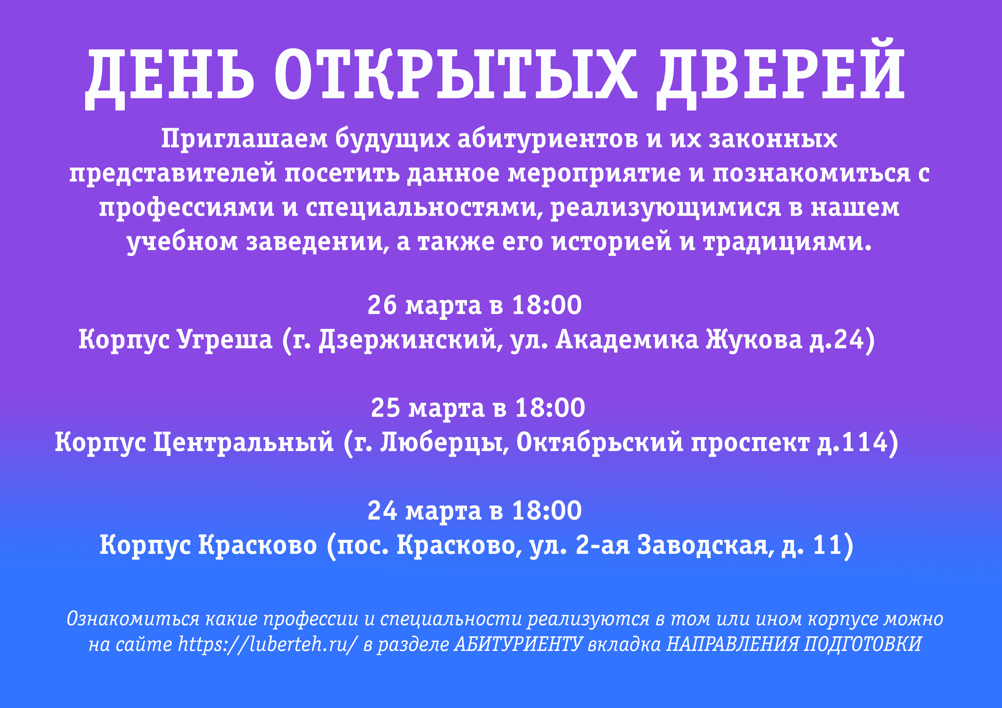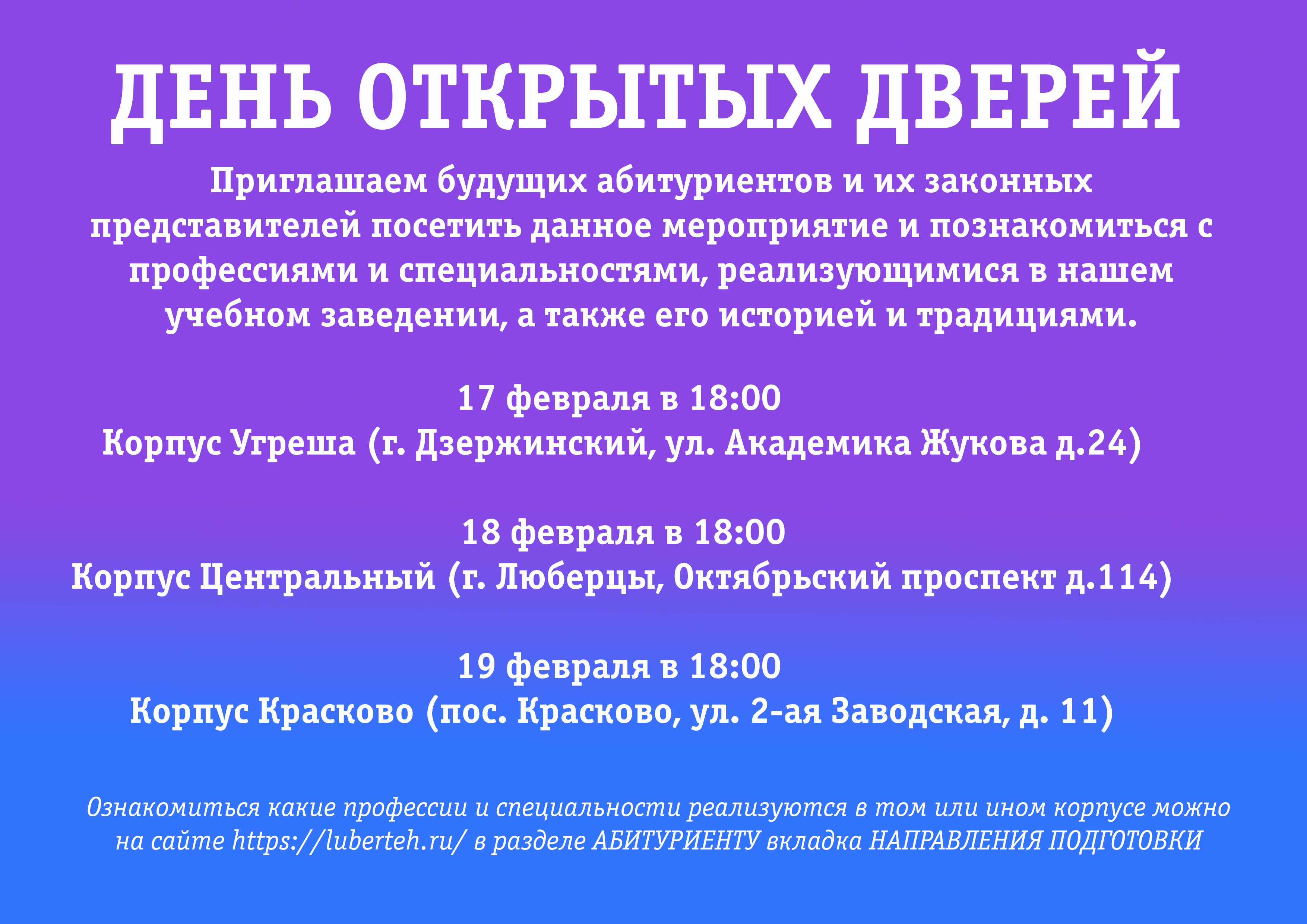Мы искренне рады приветствовать Вас на страницах официального сайта Государственного бюджетного профессионального образовательного учреждения Московской области «Люберецкий техникум имени Героя Советского Союза, лётчика-космонавта Ю.А. Гагарина»!