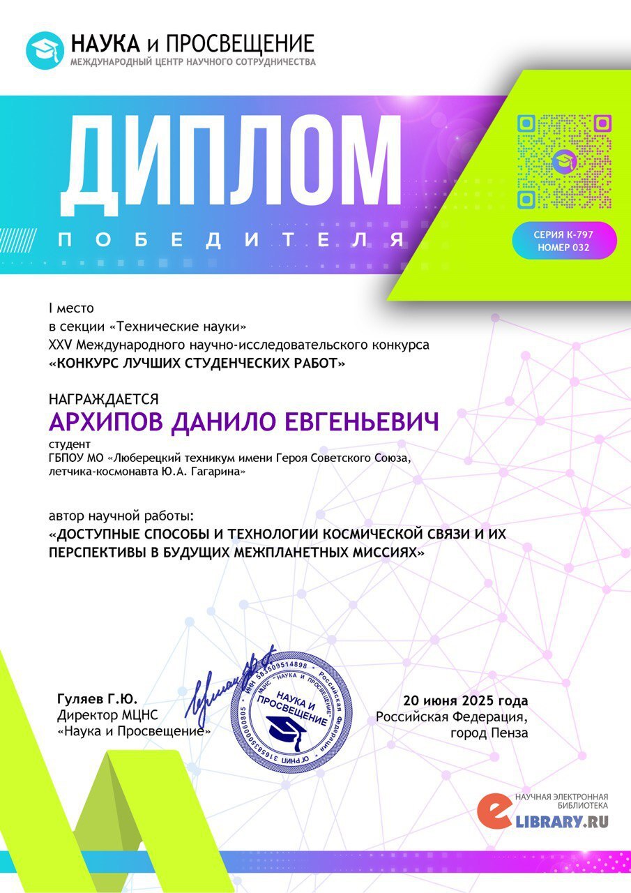 По результатам конкурса наш студент занял 1 место в секции «Технические науки» и студенческая работа вошла в сборник статей. Выбранная тема «Доступные способы и технологии космической связи и их перспективы в будущих межпланетных миссиях» особенно актуальна сегодня - в век динамично развивающихся цифровых технологий!