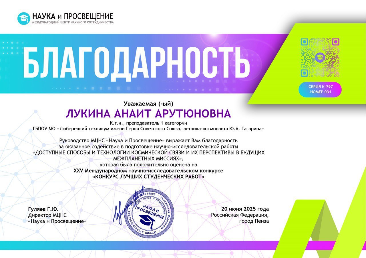 Студент 1 курса Люберецкого техникума имени Ю.А. Гагарина Архипов Данило под руководством преподавателя Лукиной Анаит Арутюновны принял участие в XXV Международном научно-исследовательском конкурсе "Конкурс лучших студенческих работ".