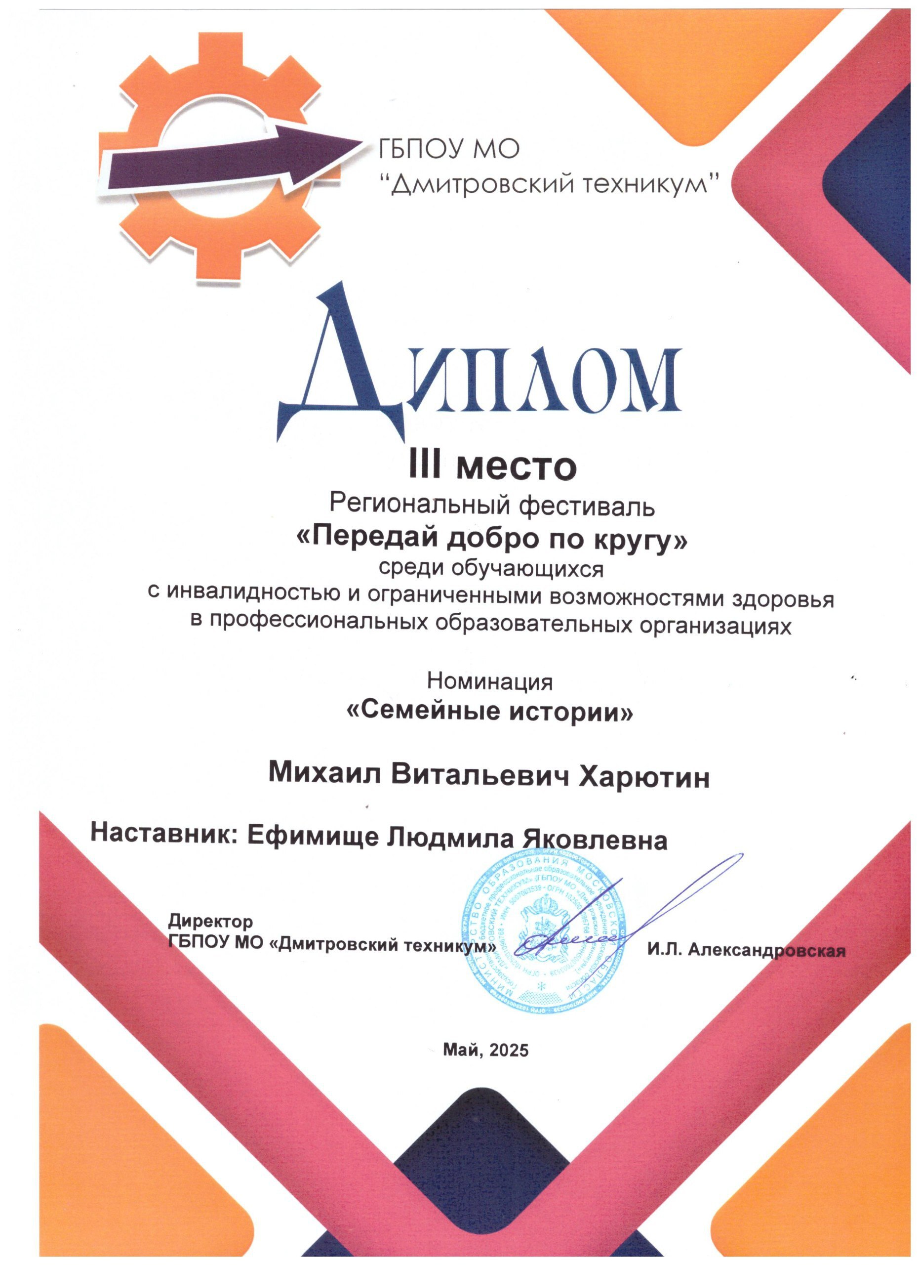 В мае месяце проходил региональный фестиваль "Передай добро по кругу". Михаил Харютин, студент 1 курса профессии «Рабочий зеленого хозяйства», принял в нем участие и занял III место!