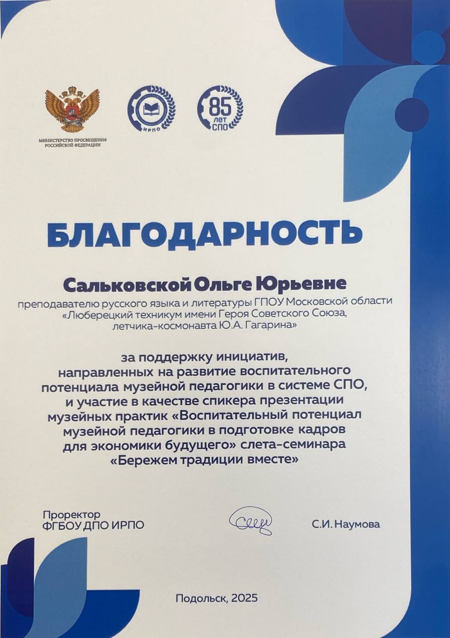 Преподаватель Люберецкого техникума имени Ю.А. Гагарина Сальковская Ольга Юрьевна выступила в качестве спикера и представила свой опыт музейных практик "Воспитательный потенциал музейной педагогики в подготовке кадров для экономике будущего".