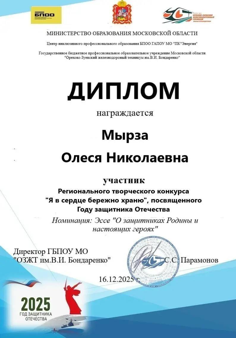 Отличные предновогодние новости! Студентка первого курса Люберецкого техникума имени Ю.А.Гагарина Олеся Мырза участвовала в Региональном творческом конкурсе « Я в сердце бережно храню!» для детей с ОВЗ. Это была её первая «проба пера» в литературном жанре эссе. Олеся написала о своем земляке, жителе Люберец Мальцеве Вадиме Петровиче, который был участником Великой Отечественной войны от ее начала и до Великой Победы. Пожелаем Олесе успехов на этом поприще. Кто знает, может, это начало ее литературного пути!