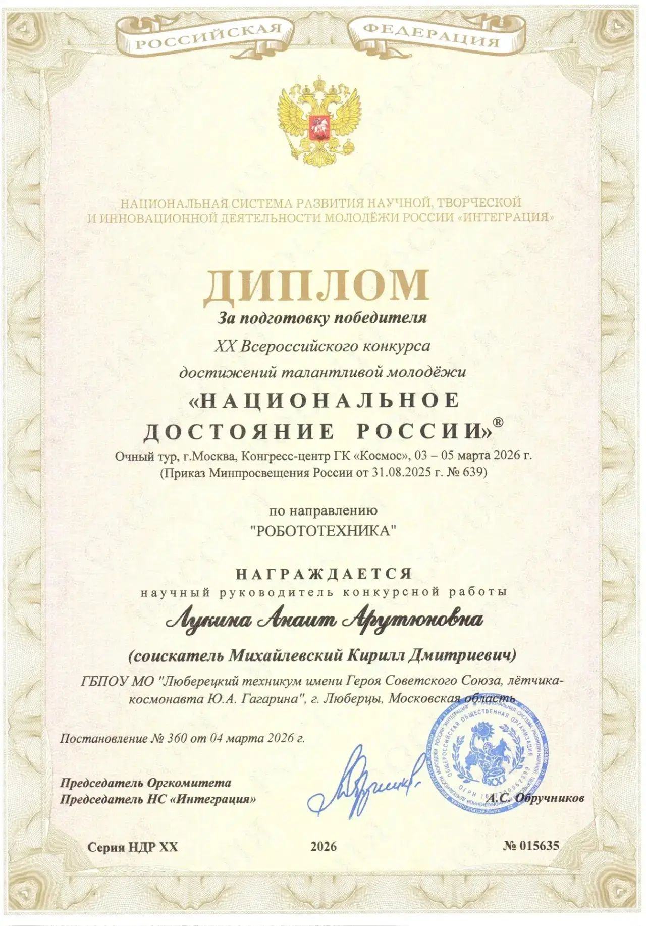 Поздравляем Кирилла, студента 3 курса специальности Эксплуатация беспилотных авиационных систем и его научного руководителя, Лукину Анаит Арутюновну, получивших также ценнейшие знаки отличия!