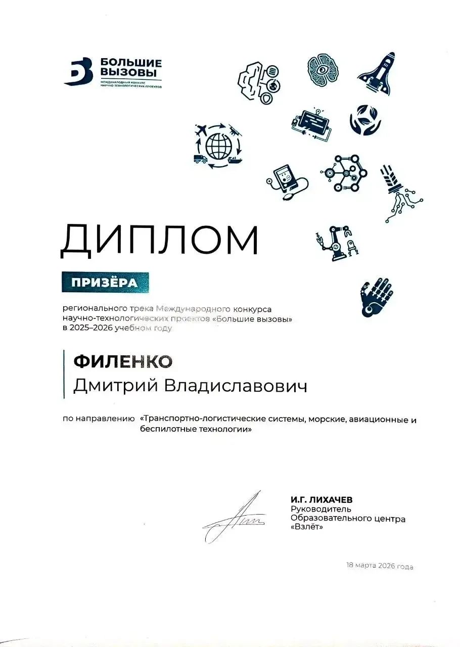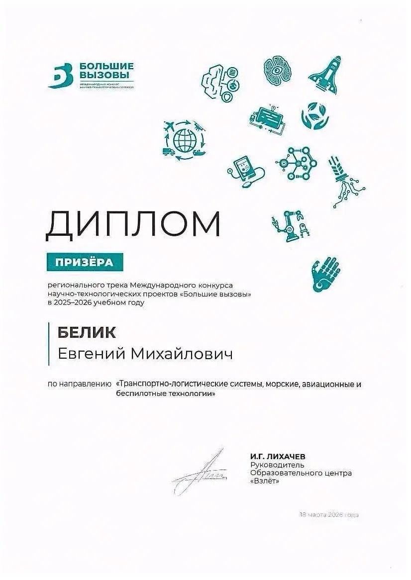 Филенко Дмитрий и Белик Евгений приняли участие в Региональном треке Международного конкурса научно-технологических проектов «Большие вызовы» (2025–2026 учебный год) по направлению «Транспортно-логистические системы, морские, авиационные и беспилотные технологии» — каждый с собственным индивидуальным проектом: